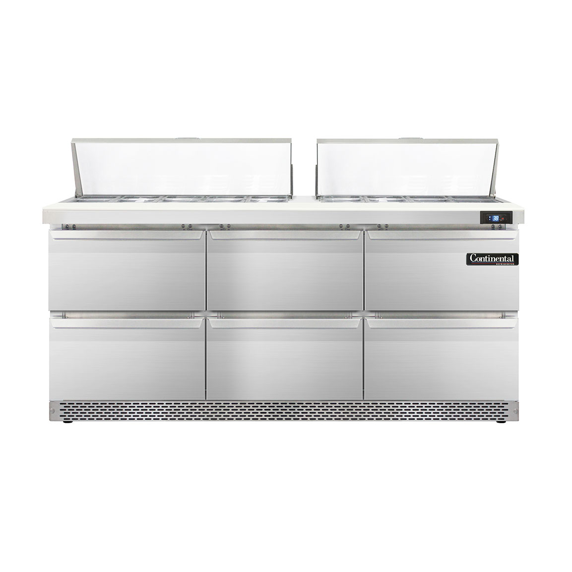 Invest in superior quality with the Continental Refrigerator D72N18-FB-D Refrigerated Counter, Sandwich / Salad Unit. This designer line sandwich unit is perfect for commercial restaurant use, offering a spacious 72" width and three sections to accommodate all your food preparation needs. With 18 1/6 size pans and a 12" cutting board, you'll have plenty of space to store and prepare ingredients. The unit also features six drawers, each capable of holding a 12 x 18 x 6 pan or a combination of 1/2 x 6 and 1/3 x 6 pans. Made in the USA, this unit is built to last with its stainless steel top, front, sides, and interior. The electronic control with digital display and hi-low alarm ensures precise temperature control and food safety. With rear-mounted self-contained refrigeration and 3-3/4" casters, this unit is easy to move and position in your kitchen. Invest in the Continental Refrigerator D72N18-FB-D and elevate your restaurant's food preparation capabilities.